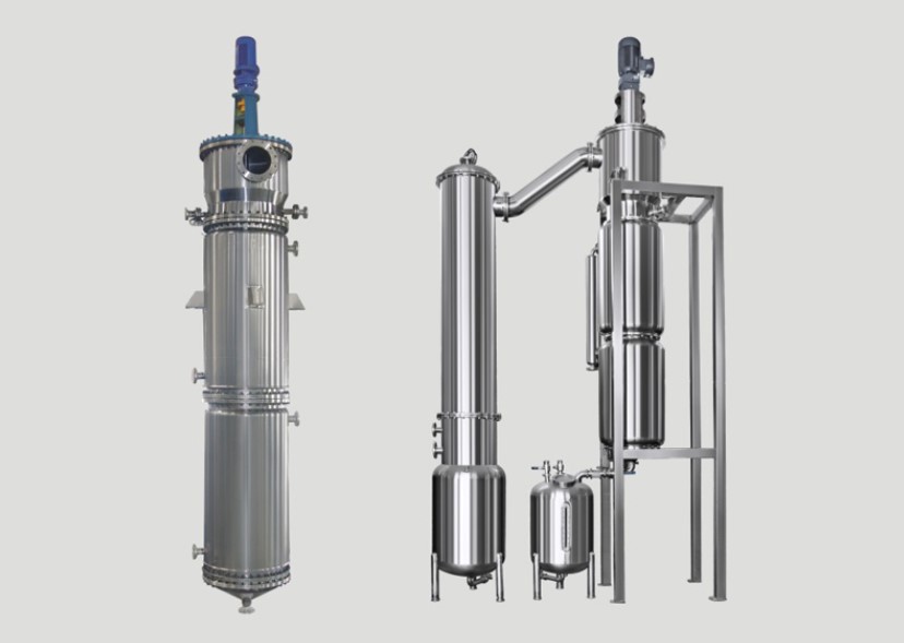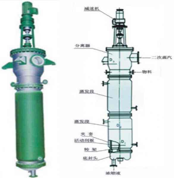 刮板薄膜蒸发器,是一种通过旋转刮板强制成膜,可在真空条件下进行降膜蒸发的新型高效蒸发器。它传热系数大、蒸发强度高、过流时间短、操作弹性大,尤其适宜热敏性物料、高粘度物料及易结晶含颗粒物料的蒸发浓缩、脱气脱溶、蒸馏提纯。